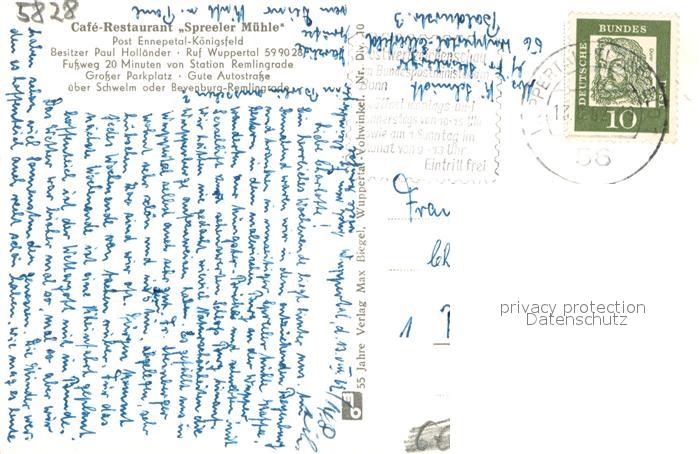 73704306 alte Postkarte Koenigsfeld Ennepetal Cafe-Restaurant Spreeler-Muehle postalisch gelaufen Erhaltung siehe scans [LiesaD40] KatCode: 11110005954008