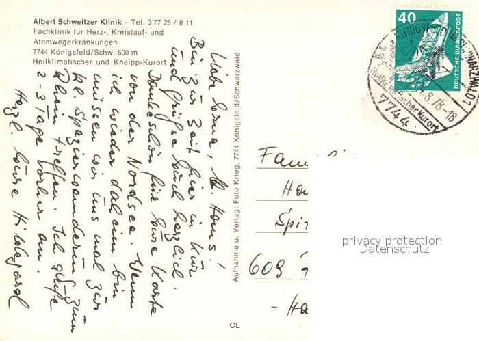 73005252 alte Postkarte Koenigsfeld Schwarzwald Albert Schweitzer Klinik postalisch gelaufen Erhaltung siehe scans [WerneD78] KatCode: 11110008326031