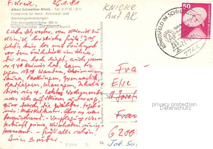 72771117 alte Postkarte Koenigsfeld Schwarzwald Albert Schweitzer Klinik postalisch gelaufen Erhaltung siehe scans [WerneD78] KatCode: 11110008326031
