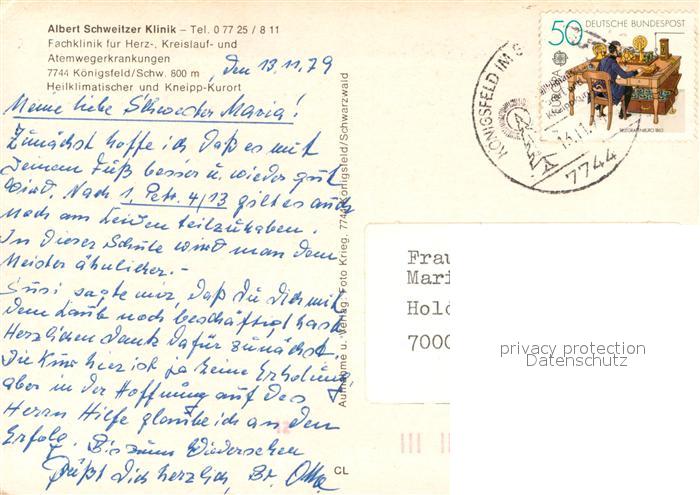 73650347 alte Postkarte Koenigsfeld Schwarzwald Albert Schweitzer Klinik postalisch gelaufen Erhaltung siehe scans [WerneD78] KatCode: 11110008326031