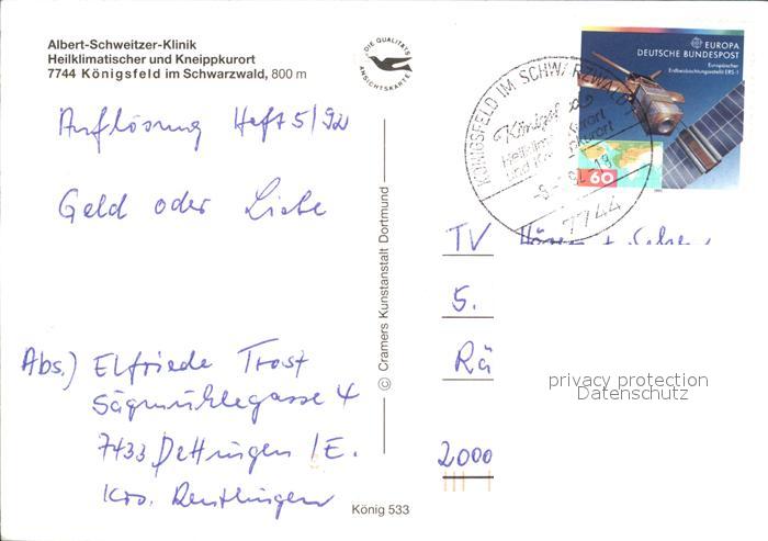 72291242 alte Postkarte Koenigsfeld Schwarzwald Albert Schweizer Klinik postalisch gelaufen Erhaltung siehe scans KatCode: 11110008326031