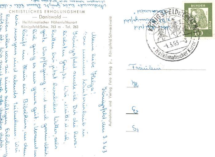 73945104 alte Postkarte Koenigsfeld Schwarzwald Christliches Erholungsheim Doniswald postalisch gelaufen Erhaltung siehe scans [FriedD77] KatCode: 11110008326031