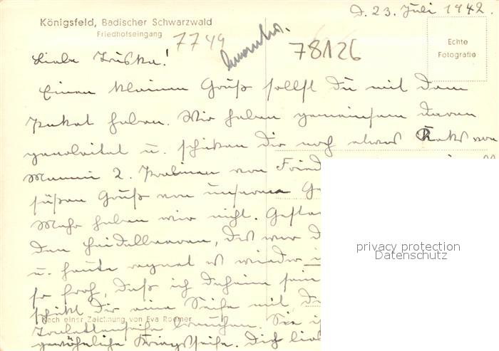 72968847 Koenigsfeld Schwarzwald Friedhofseingang nach einer Zeichnung von Eva Roemer postalisch nicht gelaufen Erhaltung siehe scans [NatalD47] KatCode: 11110008326031