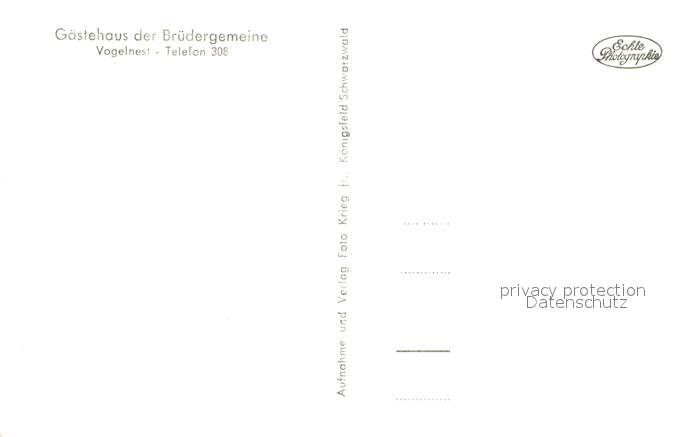 73644213 Koenigsfeld Schwarzwald Gaestehaus der Bruedergemeine Vogelnest postalisch nicht gelaufen Erhaltung siehe scans [FriedD77] KatCode: 11110008326031