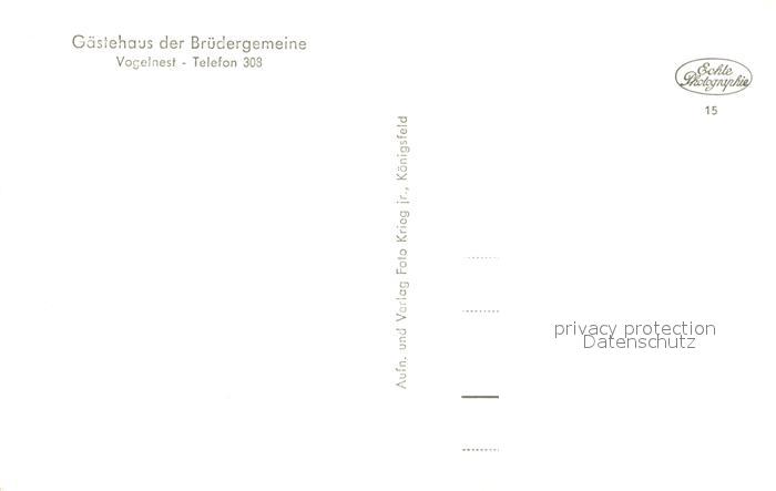 73652472 Koenigsfeld Schwarzwald Gaestehaus der Bruedergemeine Vogelnest postalisch nicht gelaufen Erhaltung siehe scans [WerneD78] KatCode: 11110008326031