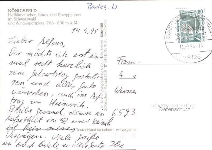 72398771 alte Postkarte Koenigsfeld Schwarzwald Panorama Kurpark Albert Schweitzer Klinik Ruine Waldau postalisch gelaufen Erhaltung siehe scans KatCode: 11110008326031
