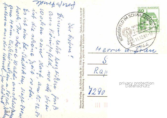 72757978 alte Postkarte Koenigsfeld Schwarzwald Schwanenteich Brunnen Ruine postalisch gelaufen Erhaltung siehe scans [NatalD47] KatCode: 11110008326031