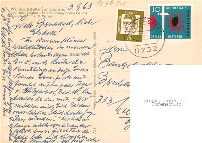 73852946 alte Postkarte Koenigshofen Bad Waldgaststaette Sambachshof Gastraeume Schwanenteich postalisch gelaufen Erhaltung siehe scans [WerneD78] KatCode: 11110009673141