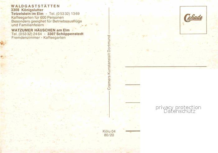 72697654 Koenigslutter Elm Waldgaststaette Tetzelstein Waldweg Ehrenmal Watzumer Haeuschen Kinderspielplatz postalisch nicht gelaufen Erhaltung siehe scans [FriedD77] KatCode: 11110003154013