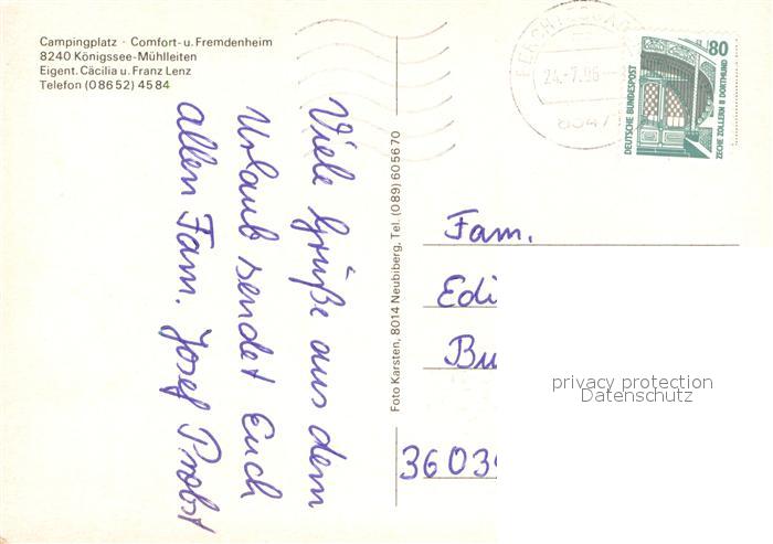73647775 alte Postkarte Koenigssee-Muehlleiten Campingplatz Comfort und Fremdenheim postalisch gelaufen Erhaltung siehe scans [WerneD78] KatCode: 11110009172132