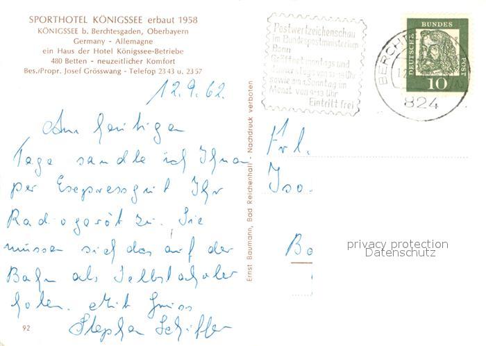 73722324 alte Postkarte Koenigssee Sporthotel Koenigssee Aussenansicht postalisch gelaufen Erhaltung siehe scans [LiesaD40] KatCode: 11110009172132