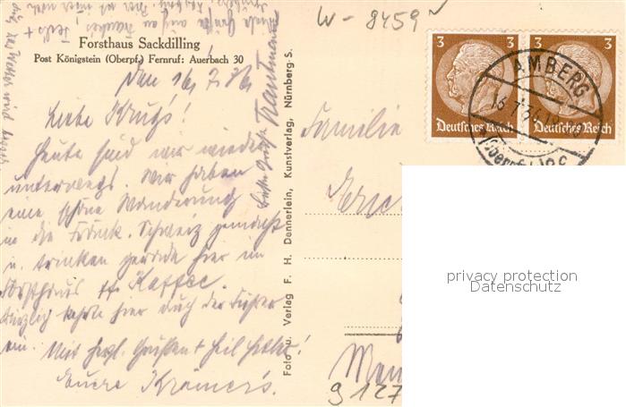 43188972 alte Postkarte Koenigstein Oberpfalz Forsthaus Sackdilling postalisch gelaufen Erhaltung siehe scans [FriedD77] KatCode: 11110009371135