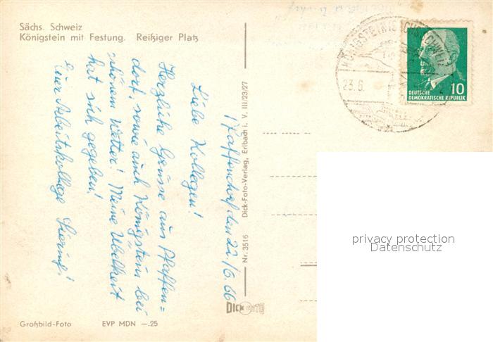73606933 alte Postkarte Koenigstein Saechsische Schweiz mit Festung Reissiger Platz postalisch gelaufen Erhaltung siehe scans [WerneD78] KatCode: 11110014287190