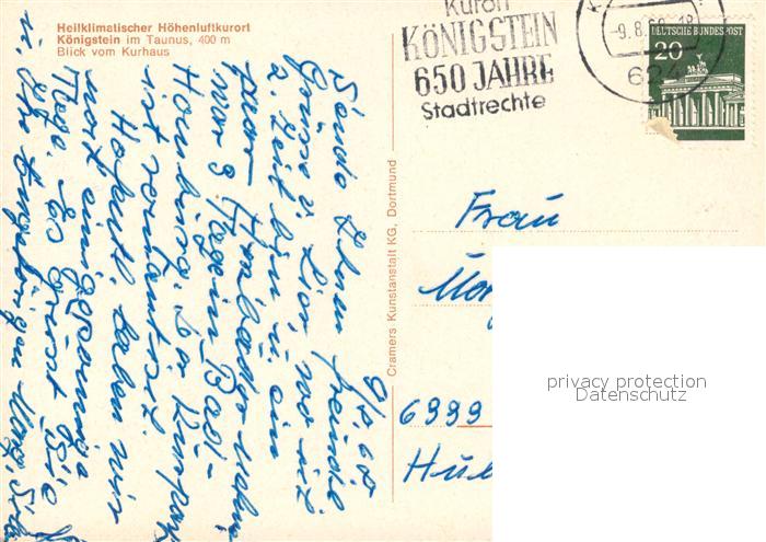 73249171 alte Postkarte Koenigstein Taunus Blick vom Kurhaus Kurpark Brunnen Burgruine postalisch gelaufen Erhaltung siehe scans [FriedD77] KatCode: 11110006434005