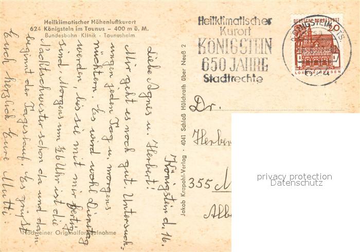 73654528 alte Postkarte Koenigstein Taunus Bundesbahn Klinik Taunusheim postalisch gelaufen Erhaltung siehe scans [WerneD78] KatCode: 11110006434005