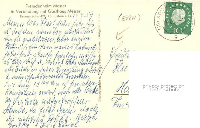 73809787 alte Postkarte Koenigstein Taunus Fremdenheim Messer Gasthaus Burgruine postalisch gelaufen Erhaltung siehe scans [FriedD77] KatCode: 11110006434005