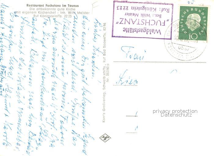 73642162 alte Postkarte Koenigstein Taunus Gaststaette Fuchstanz Falkenstein Feldberg Kronberg Reifenberg Koenigstein Gaststube postalisch gelaufen Erhaltung siehe scans [WerneD78] KatCode: 11110006434005
