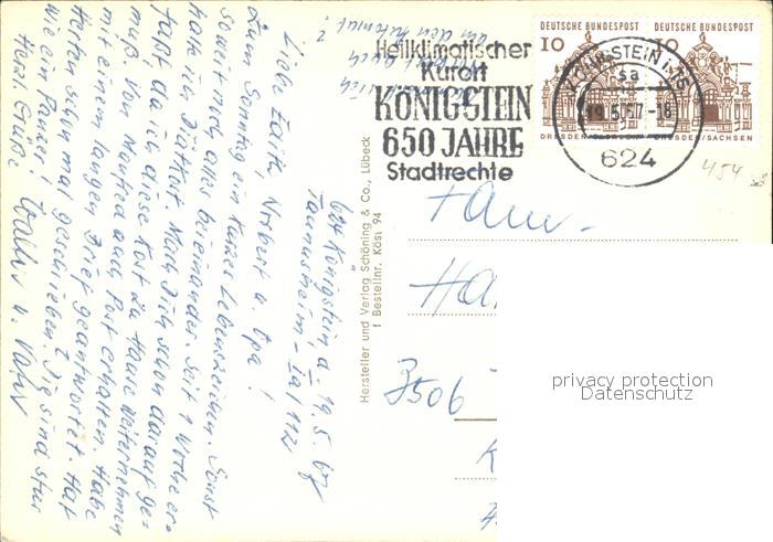 72118955 alte Postkarte Koenigstein Taunus Gesamtansicht Ruine Eisenbahnerheim Kurhaus Kurhotel Sonnenhof Kurpark Fontaene Kurhaus Klostergut Rettershof postalisch gelaufen Erhaltung siehe scans KatCode: 11110006434005