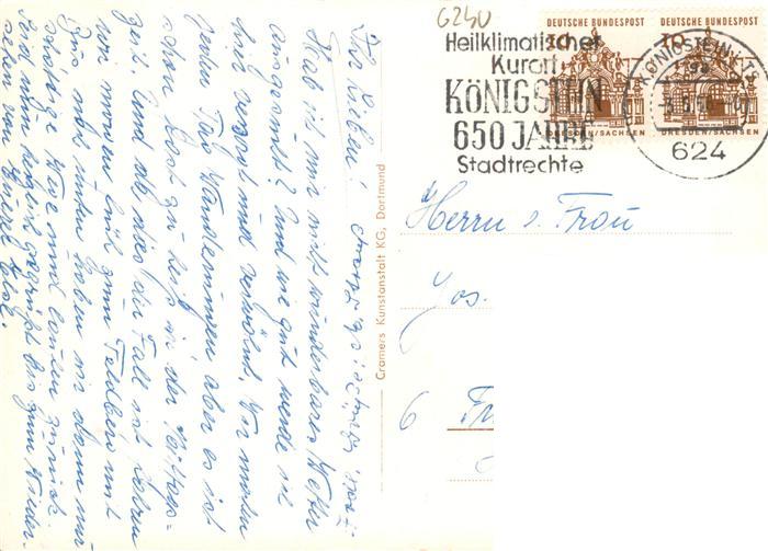 73936037 alte Postkarte Koenigstein Taunus Haus Koenigstein Kurhausbrunnen Kurhaus Taunusheim Haus der Begegnung Altes Rathaus Rosengarten Burgruine postalisch gelaufen Erhaltung siehe scans [FriedD77] KatCode: 11110006434005