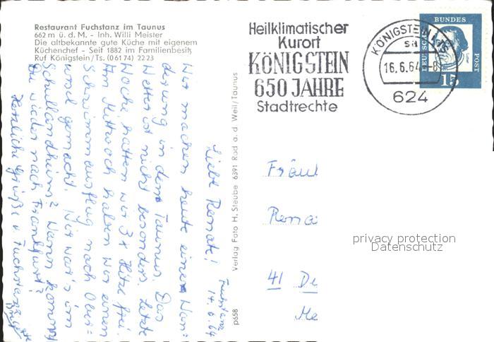 72142895 alte Postkarte Koenigstein Taunus Restaurant Fuchstanz postalisch gelaufen Erhaltung siehe scans KatCode: 11110006434005