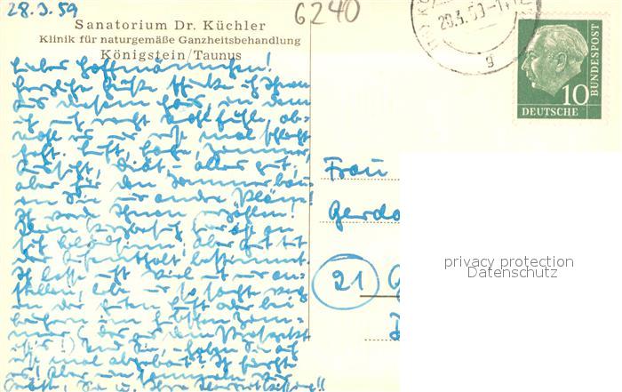 73696324 alte Postkarte Koenigstein Taunus Sanatorium Dr. Kuechler postalisch gelaufen Erhaltung siehe scans [FriedD77] KatCode: 11110006434005