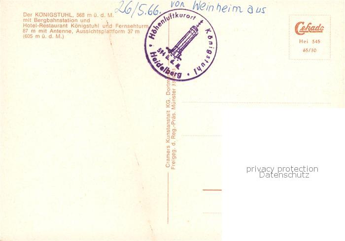 73827259 alte Postkarte Koenigstuhl Heidelberg mit Bergbahnstation und Hotel Restaurant Koenigstuhl und Fernsehturm postalisch gelaufen Erhaltung siehe scans [WerneD78] KatCode: 11110008221000