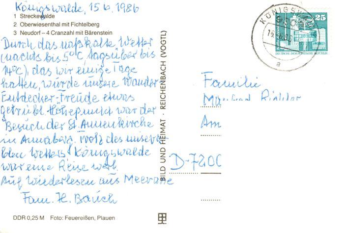 73895800 alte Postkarte Koenigswalde Erzgebirge Schmalspurbahn Streckewalde Oberwiesenthal mit Fichtelberg Neudorf Cranzahl mit Baerenstein postalisch gelaufen Erhaltung siehe scans [FriedD77] KatCode: 11110014171200