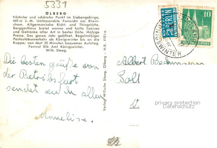 73690113 alte Postkarte Koenigswinter Berggasthaus auf dem oelberg im Siebengebirge postalisch gelaufen Erhaltung siehe scans [FriedD77] KatCode: 11110005382024