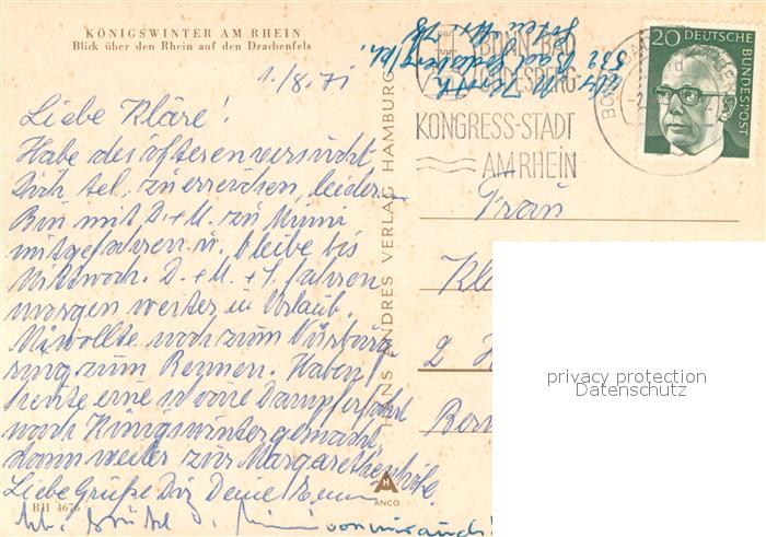 73737042 alte Postkarte Koenigswinter Blick ueber den Rhein auf den Drachenfels postalisch gelaufen Erhaltung siehe scans [FriedD77] KatCode: 11110005382024