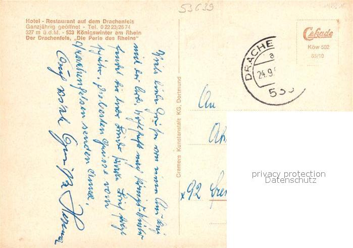 72951755 alte Postkarte Koenigswinter Drachenfels postalisch gelaufen Erhaltung siehe scans [NatalD47] KatCode: 11110005382024
