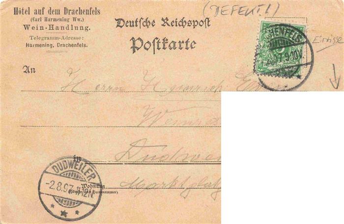 73973723 alte Postkarte Koenigswinter Hotel auf dem Drachenfels Deutsche Reichspost Litho postalisch gelaufen Erhaltung siehe scans [FriedD77] KatCode: 11110005382024
