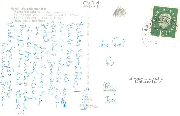 73689803 alte Postkarte Koenigswinter Hotel Loewenburger Hof Margarethenhoehe im Siebengebirge postalisch gelaufen Erhaltung siehe scans [FriedD77] KatCode: 11110005382024