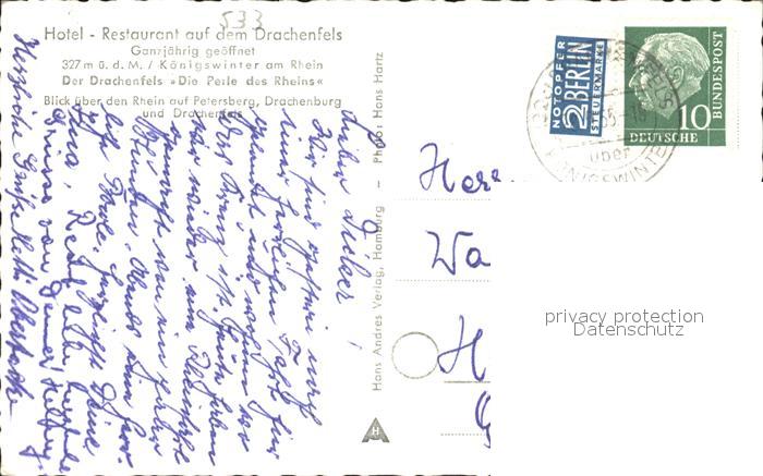72101045 alte Postkarte Koenigswinter Hotel Restaurant auf dem Drachenfels postalisch gelaufen Erhaltung siehe scans KatCode: 11110005382024