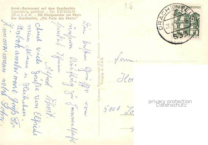 72818593 alte Postkarte Koenigswinter Hotel Restaurant Drachenfels postalisch gelaufen Erhaltung siehe scans [NatalD47] KatCode: 11110005382024