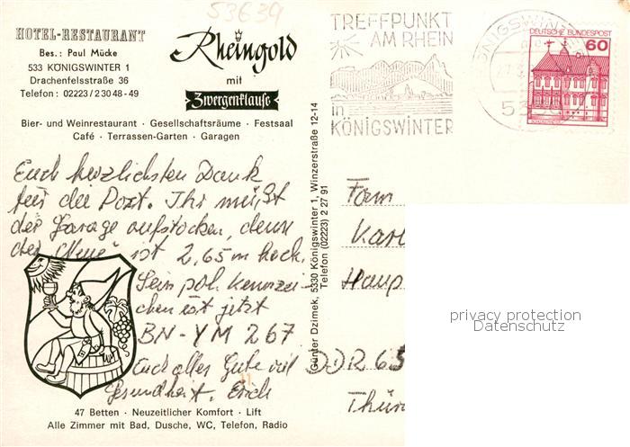 73867766 alte Postkarte Koenigswinter Hotel Restaurant Rheingold postalisch gelaufen Erhaltung siehe scans [FriedD77] KatCode: 11110005382024