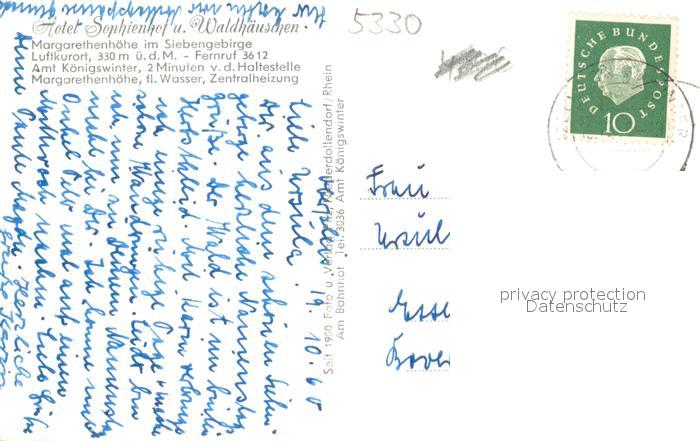 73689786 alte Postkarte Koenigswinter Hotel Sophienhof und Waldhaeuschen Margarethenhoehe mit oelberg Siebengebirge postalisch gelaufen Erhaltung siehe scans [FriedD77] KatCode: 11110005382024