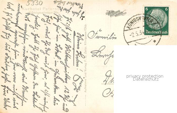 73689884 alte Postkarte Koenigswinter Kurhotel Petersberg Terrasse Blick ins Siebengebirge postalisch gelaufen Erhaltung siehe scans [FriedD77] KatCode: 11110005382024