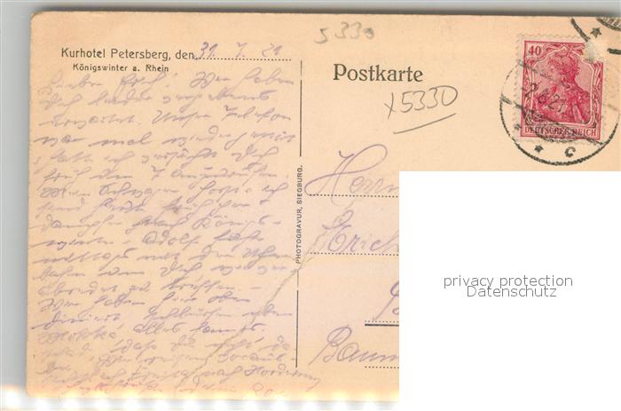 42978700 alte Postkarte Koenigswinter KurhotelPetersberg postalisch gelaufen Erhaltung siehe scans [AndreD76] KatCode: 11110005382024