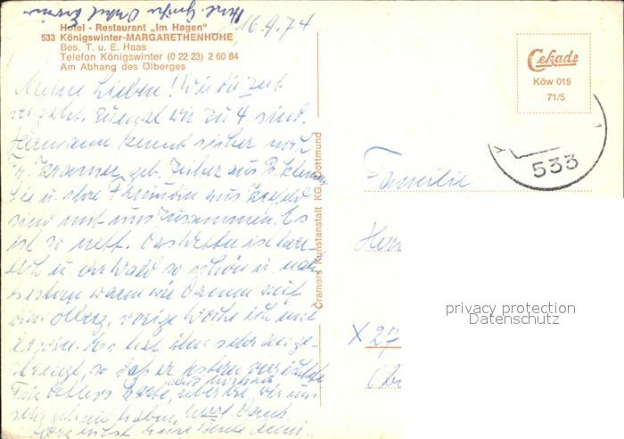 72464938 alte Postkarte Koenigswinter Margaretenhoehe Hote Restaurant Im Hagen postalisch gelaufen Erhaltung siehe scans KatCode: 11110005382024