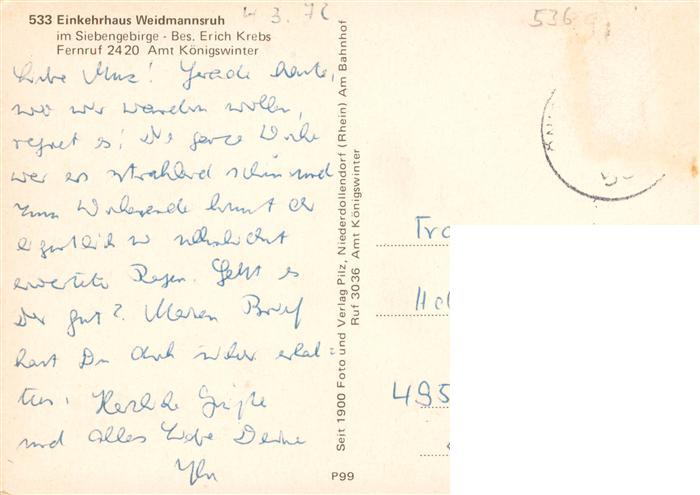 73906304 Koenigswinter Rhein Einkehrhaus Weidmannsruh postalisch gelaufen Erhaltung siehe scans [FriedD77] alte Postkarte Frie Katcode 11110005382024