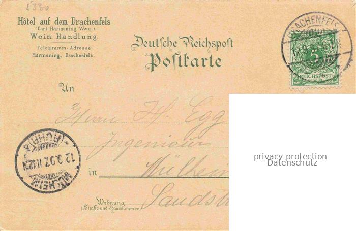 74010253 alte Postkarte Koenigswinter Rhein Hotel auf dem Drachenfels Terrasse Blick ueber den Rhein Litho Deutsche Reichspost postalisch gelaufen Erhaltung siehe scans [FriedD77] KatCode: 11110005382024