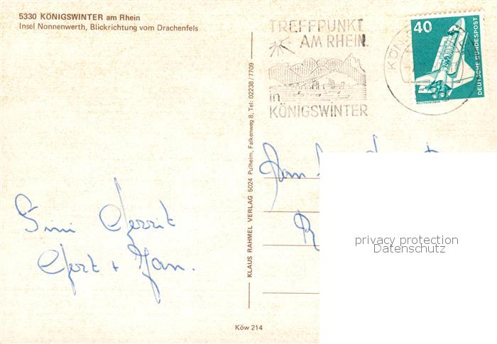 73813217 Koenigswinter Rhein Insel Nonnenwerth Blick vom Drachenfels postalisch gelaufen Erhaltung siehe scans [WerneD78] alte Postkarte Wern Katcode 11110005382024