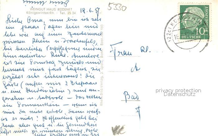 73689891 alte Postkarte Koenigswinter Weingut Hans Ruedenet Blick auf den Rhein postalisch gelaufen Erhaltung siehe scans [FriedD77] KatCode: 11110005382024