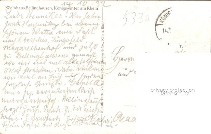 31821752 alte Postkarte Koenigswinter Weinhaus Bellinghausen postalisch gelaufen KatCode: 11110005382024