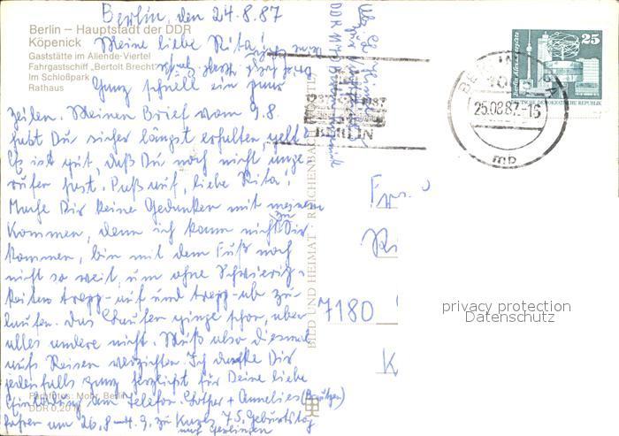 72109673 alte Postkarte Koepenick Gaststaette am Allendeviertel MS Bertold Brecht Schlosspark Rathaus postalisch gelaufen Erhaltung siehe scans KatCode: 11110011000000