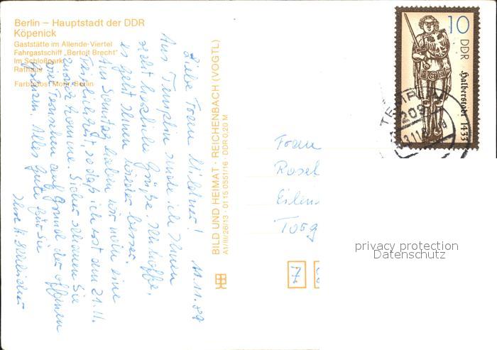 72547449 alte Postkarte Koepenick Gaststaette im Allende Viertel Fahrgastschiff Bertolt Brecht Schlosspark Rathaus postalisch gelaufen Erhaltung siehe scans [WerneD78 kv017box] KatCode: 11110011000000