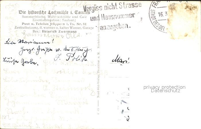 72097073 alte Postkarte Koeppern Taunus Historische Lochmuehle postalisch gelaufen Erhaltung siehe scans KatCode: 11110006434002