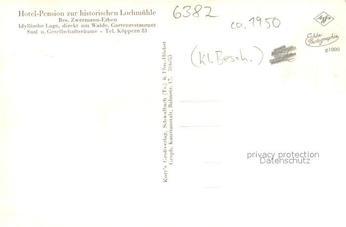 73705477 Koeppern Taunus Hotel-Pension Zur historischen Lochmuehle postalisch nicht gelaufen Erhaltung siehe scans [LiesaD40] KatCode: 11110006434002