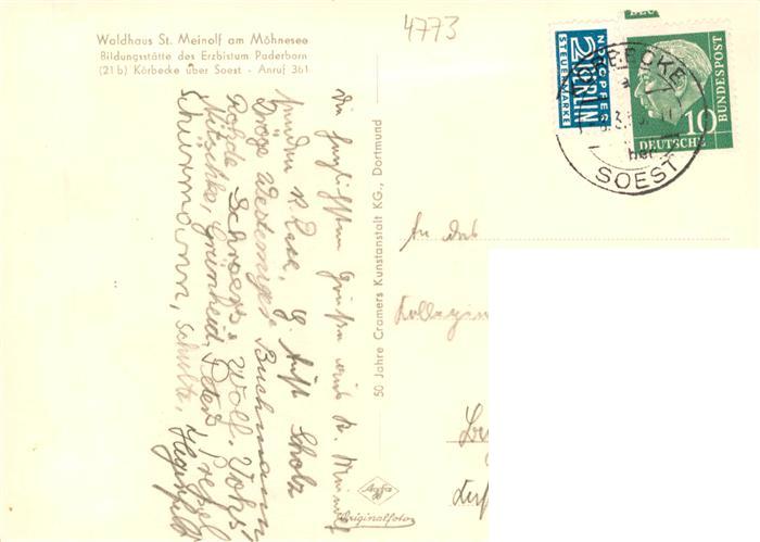 73894001 alte Postkarte Koerbecke Moehnesee Waldhaus St Meinolf Fliegeraufnahme postalisch gelaufen Erhaltung siehe scans [FriedD77] KatCode: 11110005974032