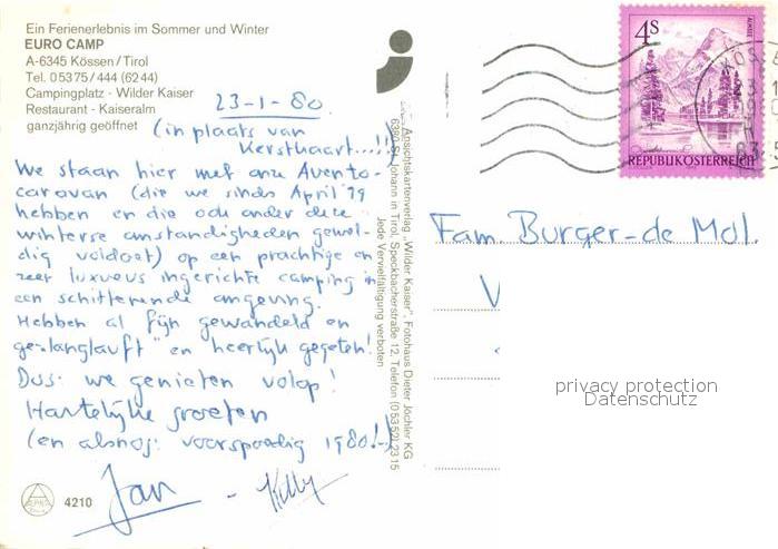 72711713 alte Postkarte Koessen Tirol Euro Camp Campingplatz Restaurant Kaiseralm Kamin Winterpanorama Kaisergebirge postalisch gelaufen Erhaltung siehe scans [FriedD77] KatCode: 11390335070412